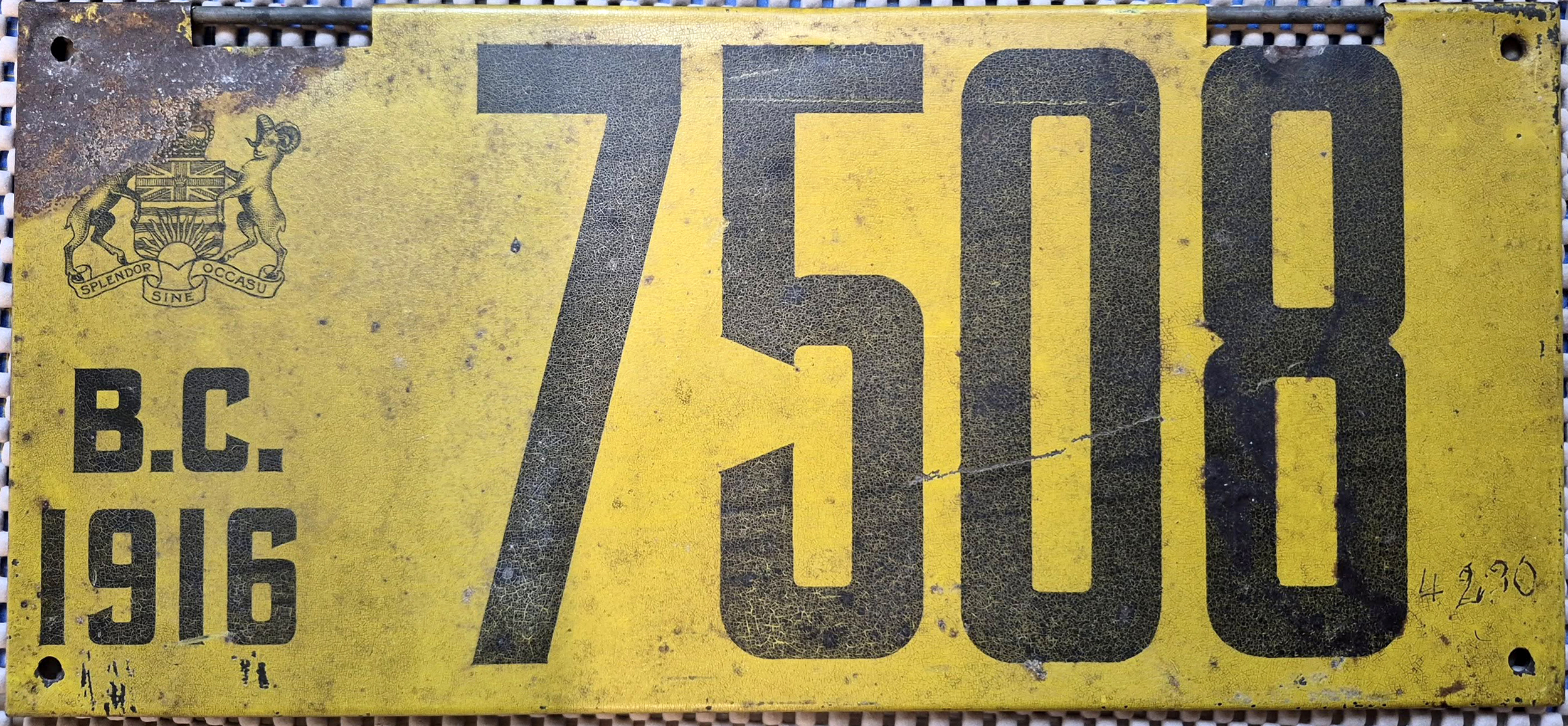 While technically an authentic 1917 BC license plate, the specimen below was sold on an internet auction site in 2019, one presumes, for the purposes of being "restored". Given the poor state of the plate, if it is restored any number applied will be completely ficticious, pushing the plate into the realm of reproductions. We await to see if this plate resurfaces at some future point: