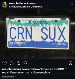 In a fun twist to this story, the satirical site "Real Chilliwack News" posted on social media a purported request by "Chilliwack" to have a personalized slogan stating "CRN SUX" recalled for being offensive!