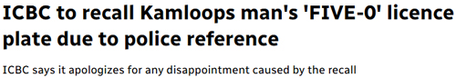 In December of 2025, it was reported that ICBC was recalling a personalised licence plate displaying the slogan "FIVE-O" on the basis that it was a prohibited slogan due to it being a reference to law enforcement.